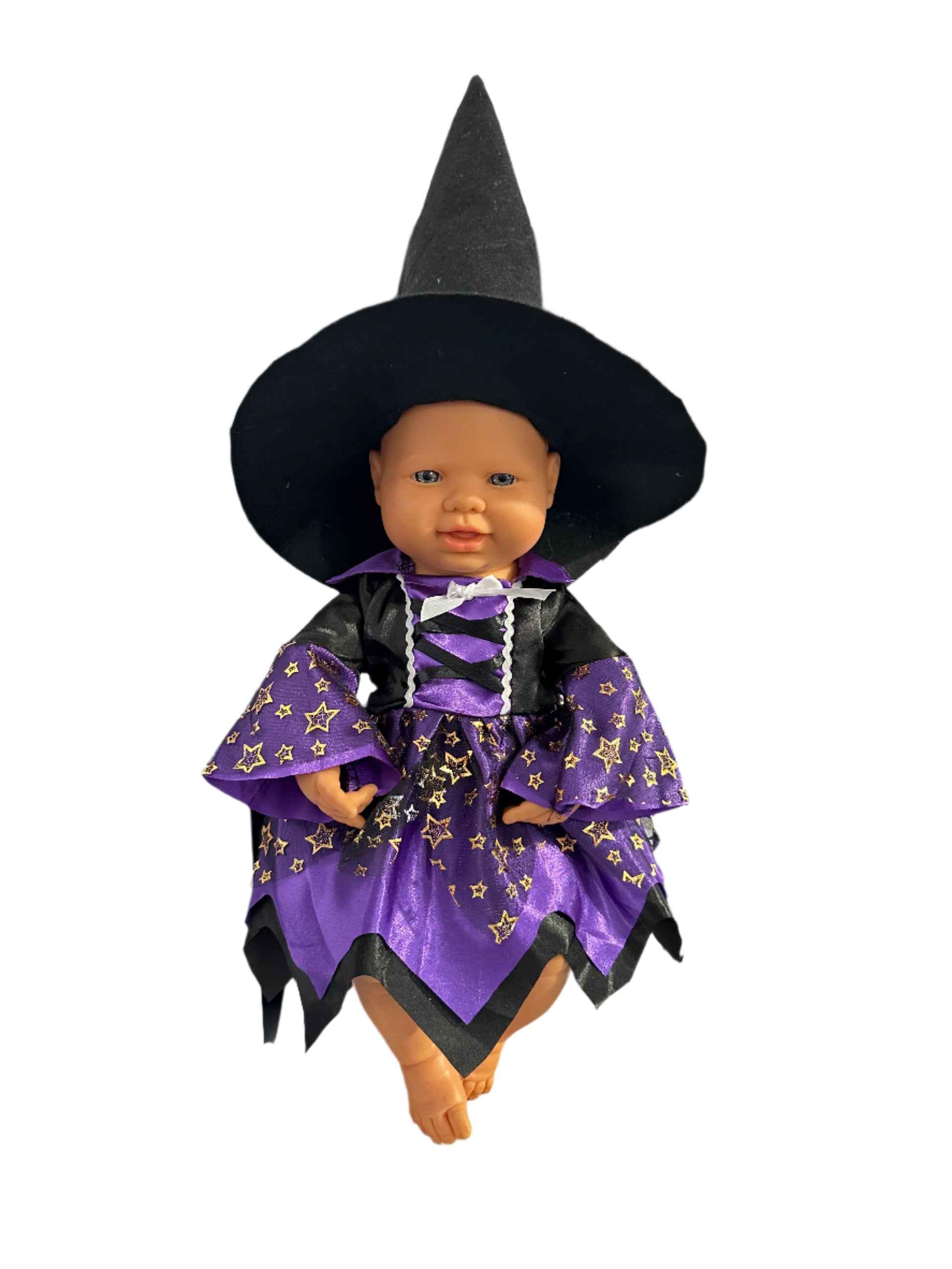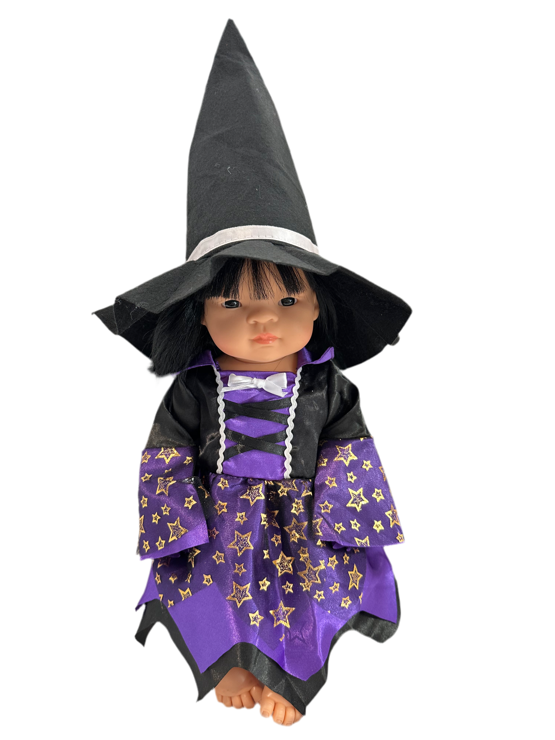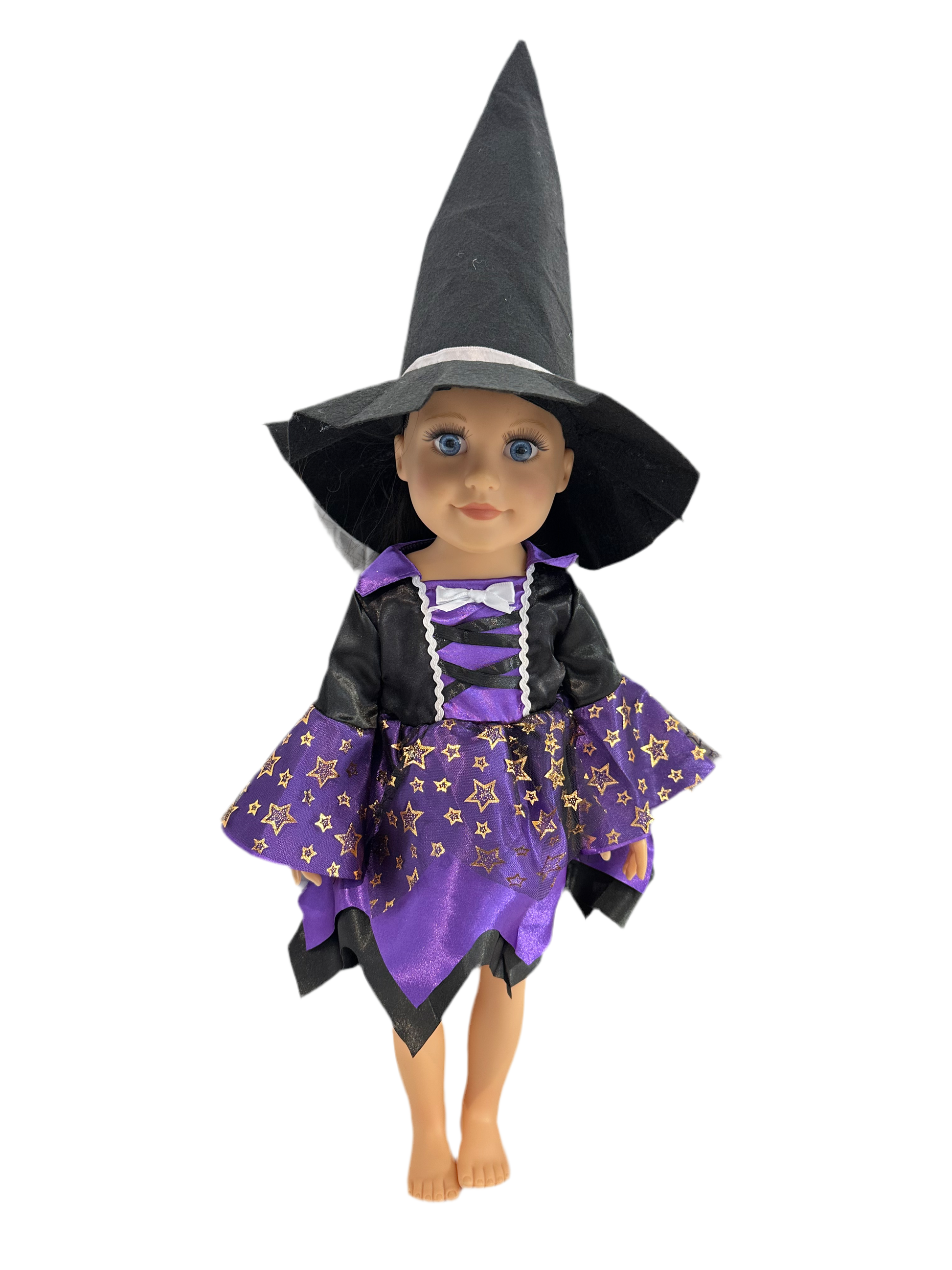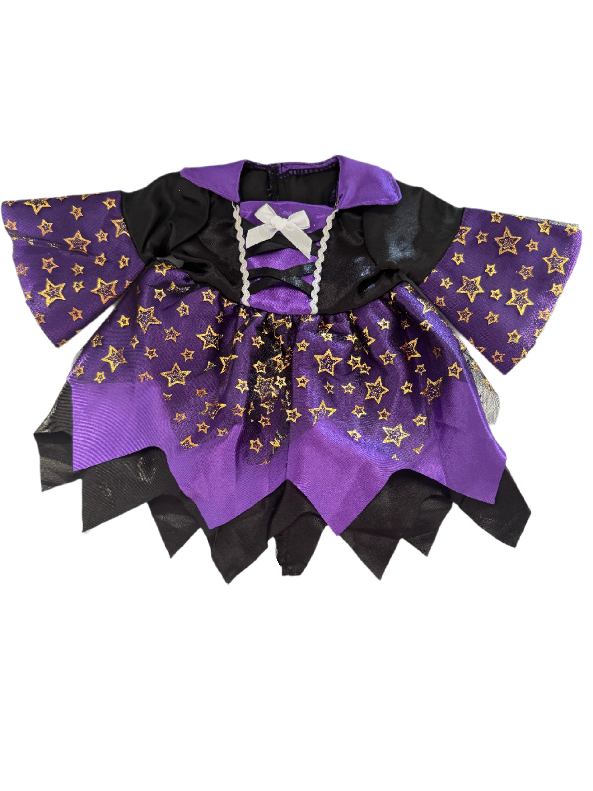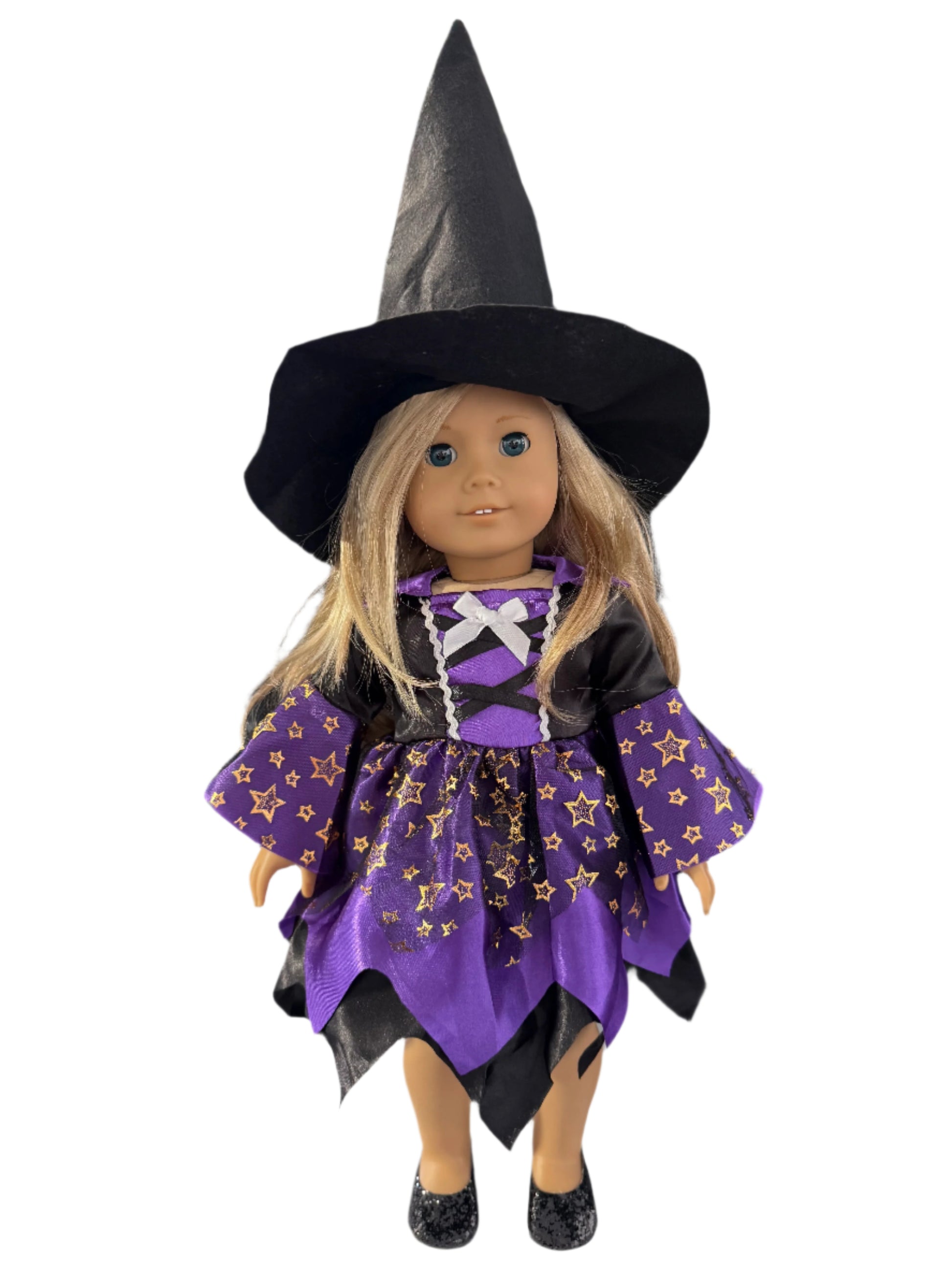 Get ready for some spooky fun with our Black & Purple Stars Witch Halloween Doll Costume! This adorable 2-piece set is perfect for dressing up your favourite dolls for the season. Featuring a classic witch hat and a matching dress in vibrant black and purple stars, your doll will be the cutest little sorceress on the block. Let the magical make-believe begin!
